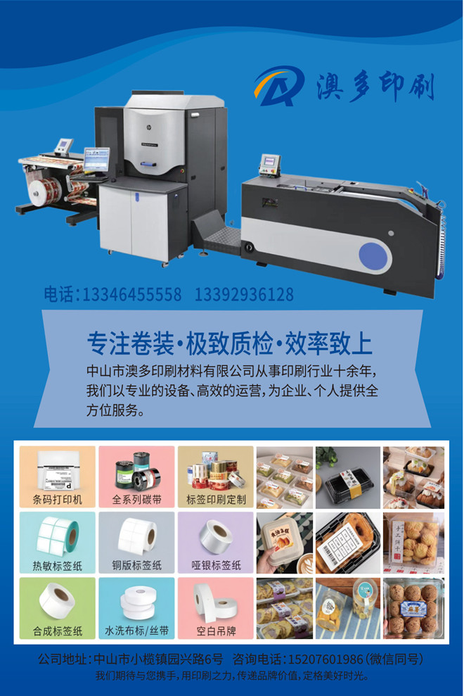 中山市澳多印刷材料有限公司从事印刷行业十余年,疫情四年快速发展,从十几个人的小公司一跃成位中山标签印刷界龙头企业。